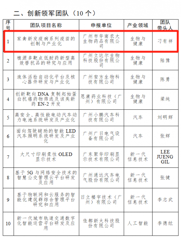 5月23日,2019年度廣州市產(chǎn)業(yè)領(lǐng)軍人才重點(diǎn)項(xiàng)目擬入選人員(團(tuán)隊(duì))公示,按照關(guān)于加快集聚產(chǎn)業(yè)領(lǐng)軍人才的意見(jiàn)相關(guān)規(guī)定,經(jīng)申報(bào)評(píng)審各項(xiàng)程序,廣州市華南農(nóng)大生物藥品有限公司擬入選“2019年度廣州市創(chuàng)新領(lǐng)軍團(tuán)隊(duì)”。