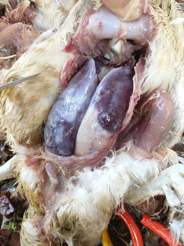 4.1急性敗血癥:在孵化器內(nèi)感染的雛禽,出殼第一天的死亡率可達40%,10天左右的死亡率達20%-30%,本病危害最大的日齡是7-20天。雛雞發(fā)病,外表無特殊癥狀,可見采食量下降,精神沉郁,羽毛蓬松,畏寒打顫,腹部膨脹,出現(xiàn)白色或綠色下痢,最后衰竭而死,剖檢呈典型的纖維素心包炎,心包膜混濁增厚,其上有大量灰白色片狀纖維素滲出物,這種滲出物也可見于胸腔、氣囊壁上。肝臟腫脹,伴有肝周炎,肝外膜也有白色纖維素滲出物。