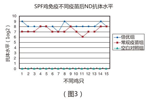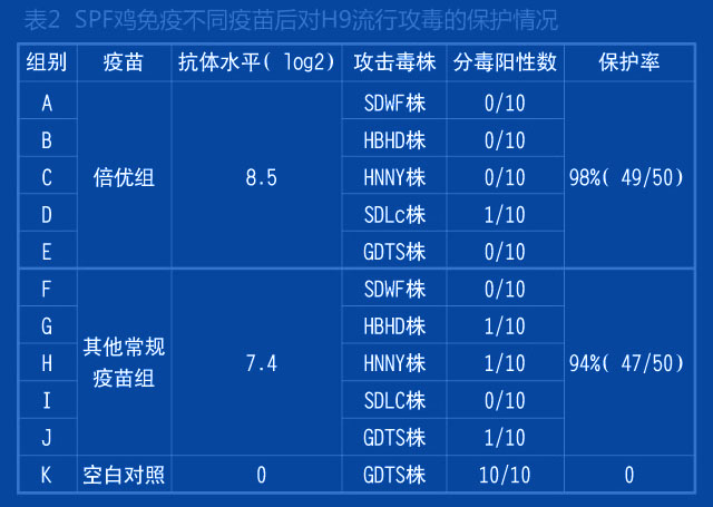 在實(shí)驗(yàn)室條件下,SPF雞7日齡一次免疫倍優(yōu)TM系列產(chǎn)品(ND+H9 ) 0.1ml,免疫后21天采用各地分離的流行H9毒株行攻毒,倍優(yōu)組的攻毒保 護(hù)為98% (表2)。