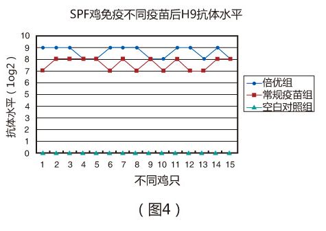 (一)在實(shí)驗(yàn)室條件下,SPF雞7日齡一次免疫倍優(yōu)?系列產(chǎn)品(ND + H9 ) 0.1ml ,免疫后21天,倍優(yōu)組ND和H9抗 體分別達(dá)到8.1log2 (圖3 )和8.6log2 (圖4 );常規(guī)疫苗組ND和H9抗體分別僅為7.3log2 (圖3 )和7.6log2 (圖4)。