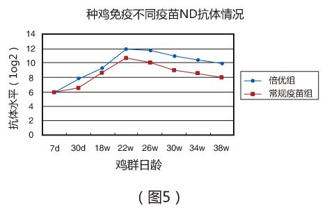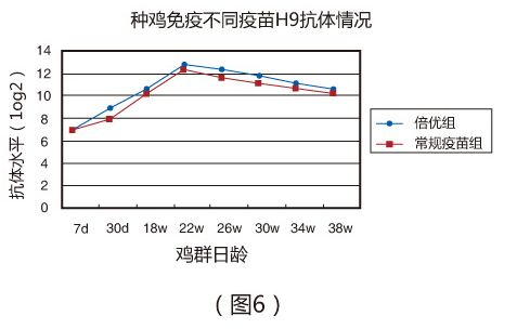 (二)在現(xiàn)場(chǎng)條件下,種雞分別與7日、30日和18周分別免疫倍優(yōu)TM系列產(chǎn)品(ND+H9),劑量分別為0.1ml、 0.3m和0.3ml。于22周,倍優(yōu)組ND和H9抗體分別達(dá)到12log2 (圖5 )和12.2log2 (圖6 ),且維持時(shí)間明顯優(yōu)于常規(guī)疫苗組;常規(guī)疫苗組ND和H9抗體分別僅為10.7log2 (圖5 )和11.8log2(圖6 )。