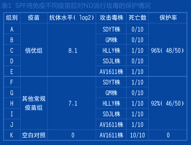 在實(shí)驗(yàn)室條件下,SPF雞7日齡一次免疫倍優(yōu)系列產(chǎn)品(ND+H9 ) 0.1ml ,免疫后21天采用各地分離的流行ND毒株(基因VII型)進(jìn)行攻毒, 倍優(yōu)組的攻毒保護(hù)為96%(表1)。