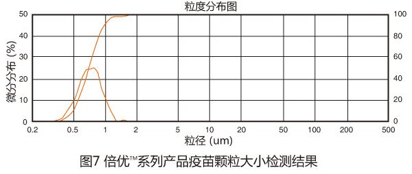 倍優(yōu)?系列產(chǎn)品每一個(gè)疫苗毒株均單獨(dú)接種雞胚,分別采毒后經(jīng)超高超微分離濃縮后再純化,高度去除雞胚尿棄液中的尿酸鹽、脂多糖等雜質(zhì),經(jīng)過(guò)高度純化和超高濃縮后,在進(jìn)行抗體復(fù)配,確??乖煞謫我?,從而保證乳化后的疫苗顆粒大小適中、均勻,有效刺激機(jī)體產(chǎn)生高而待久的抗體水平;倍優(yōu)?系列產(chǎn)品疫苗顆粒大小0.5~0.6μm ,該大小顆粒占95%以上(圖7)。