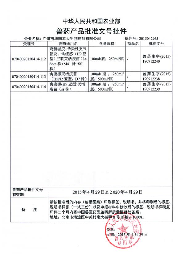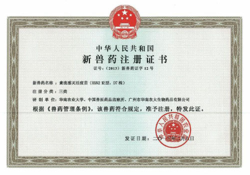 目前已獲得國(guó)家農(nóng)業(yè)部新獸藥證書(shū)及產(chǎn)品批準(zhǔn)文號(hào)。