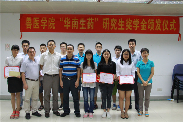 2015年6月24日下午3:30,“華南生藥”研究生獎(jiǎng)學(xué)金頒獎(jiǎng)暨揭牌儀式在農(nóng)業(yè)部畜禽產(chǎn)品質(zhì)量監(jiān)督檢驗(yàn)測(cè)試中心101報(bào)告廳舉行。廣州市華南農(nóng)大生物藥品有限公司梁昭平總經(jīng)理、營(yíng)銷中心黃國(guó)城副總經(jīng)理、公司技術(shù)部李敏經(jīng)理、行政拓展部許芬芬經(jīng)理、我校獸醫(yī)學(xué)院黨委書(shū)記梁梓森、黨委副書(shū)記楊利江、輔導(dǎo)員陳曉梅老師、全體獲獎(jiǎng)學(xué)生和學(xué)生代表出席并參加了掛牌儀式和頒獎(jiǎng)典禮。
