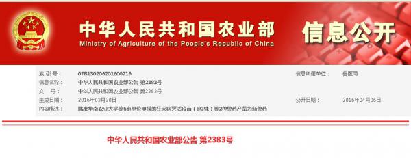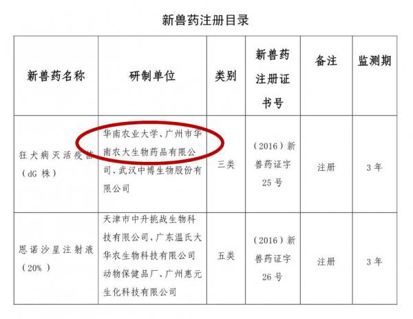 根據(jù)《獸藥管理條例》和《獸藥注冊辦法》規(guī)定,經(jīng)審查,批準(zhǔn)華南農(nóng)業(yè)大學(xué)等6家單位申報的狂犬病滅活疫苗(dG株)等2種獸藥產(chǎn)品為新獸藥,核發(fā)《新獸藥注冊證書》,并發(fā)布產(chǎn)品試行規(guī)程、質(zhì)量標(biāo)準(zhǔn)、說明書和標(biāo)簽,自發(fā)布之日起執(zhí)行。
