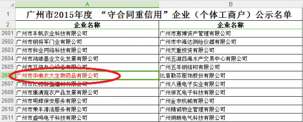 根據(jù)廣東省工商行政管理局《關(guān)于印發(fā)廣東省守合同重信用企業(yè)公示活動(dòng)規(guī)則的通知》(粵工商市字〔2009〕697號(hào))和廣州市工商行政管理局《關(guān)于守合同重信用公示活動(dòng)有關(guān)問題的通知》(穗工商合〔2013〕209號(hào))精神,經(jīng)廣州各行業(yè)協(xié)(商)會(huì)推薦,并征求各有關(guān)部門的意見,認(rèn)為廣州市華南農(nóng)大生物藥品有限公司符合廣州市2015年度 “守合同重信用”公示條件。