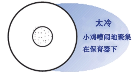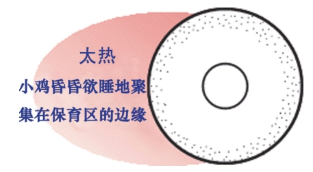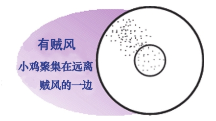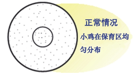 (3)雞舍內(nèi)的溫度要保持均衡和穩(wěn)定,避免溫度忽高忽低和雞舍兩端溫差過大,檢查溫度是否合適的最佳方法,是觀察雞苗的分布狀態(tài)及活動表現(xiàn)(如下圖,中間小圓圈為加熱器)。